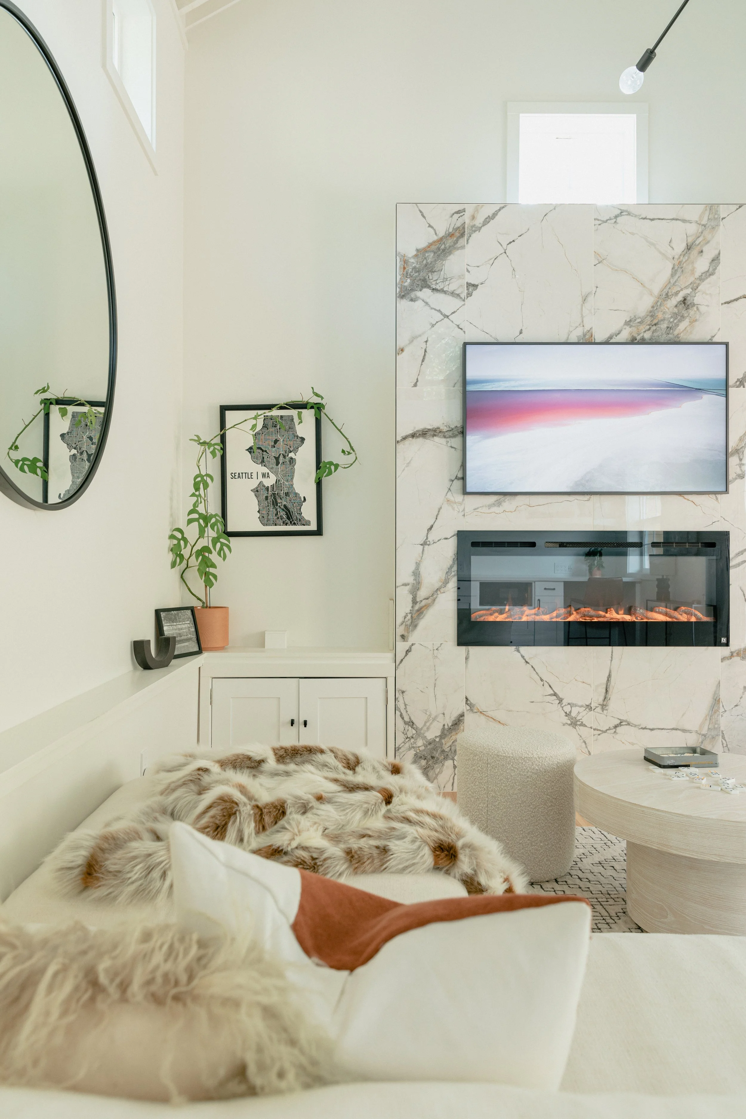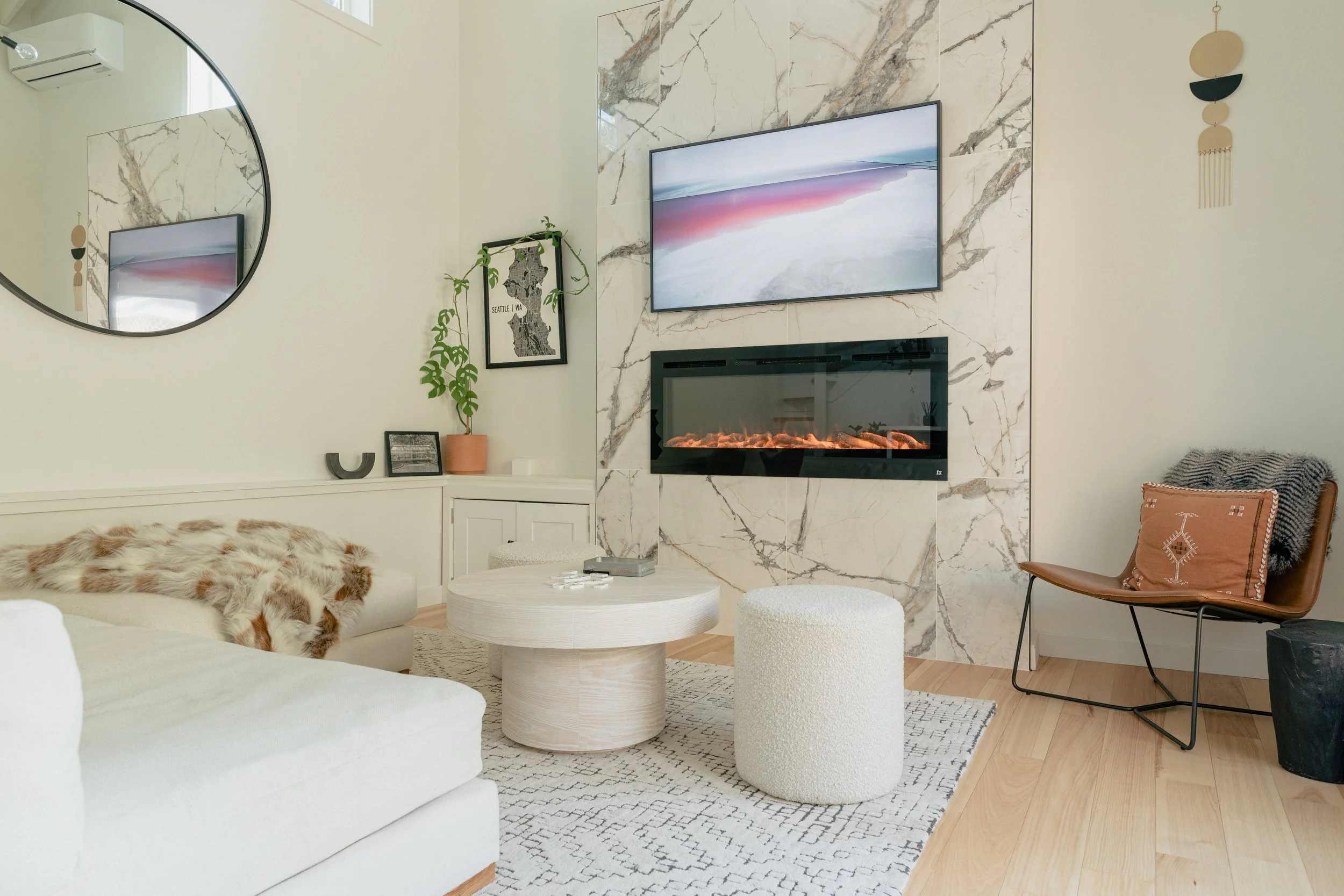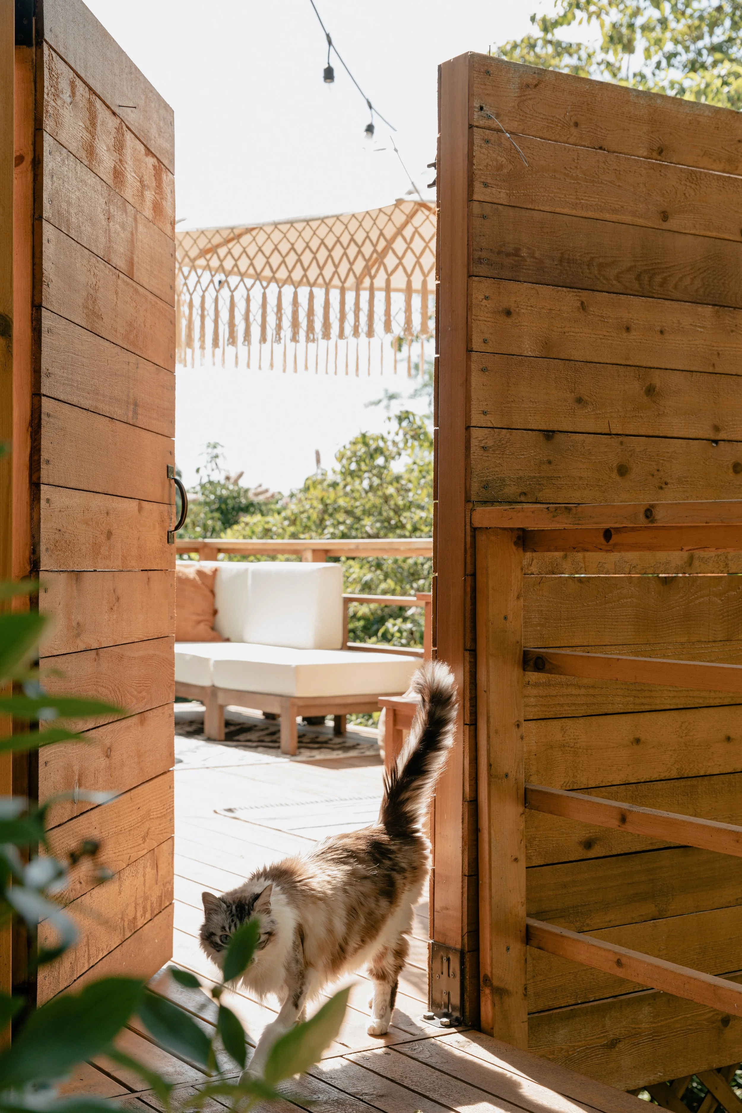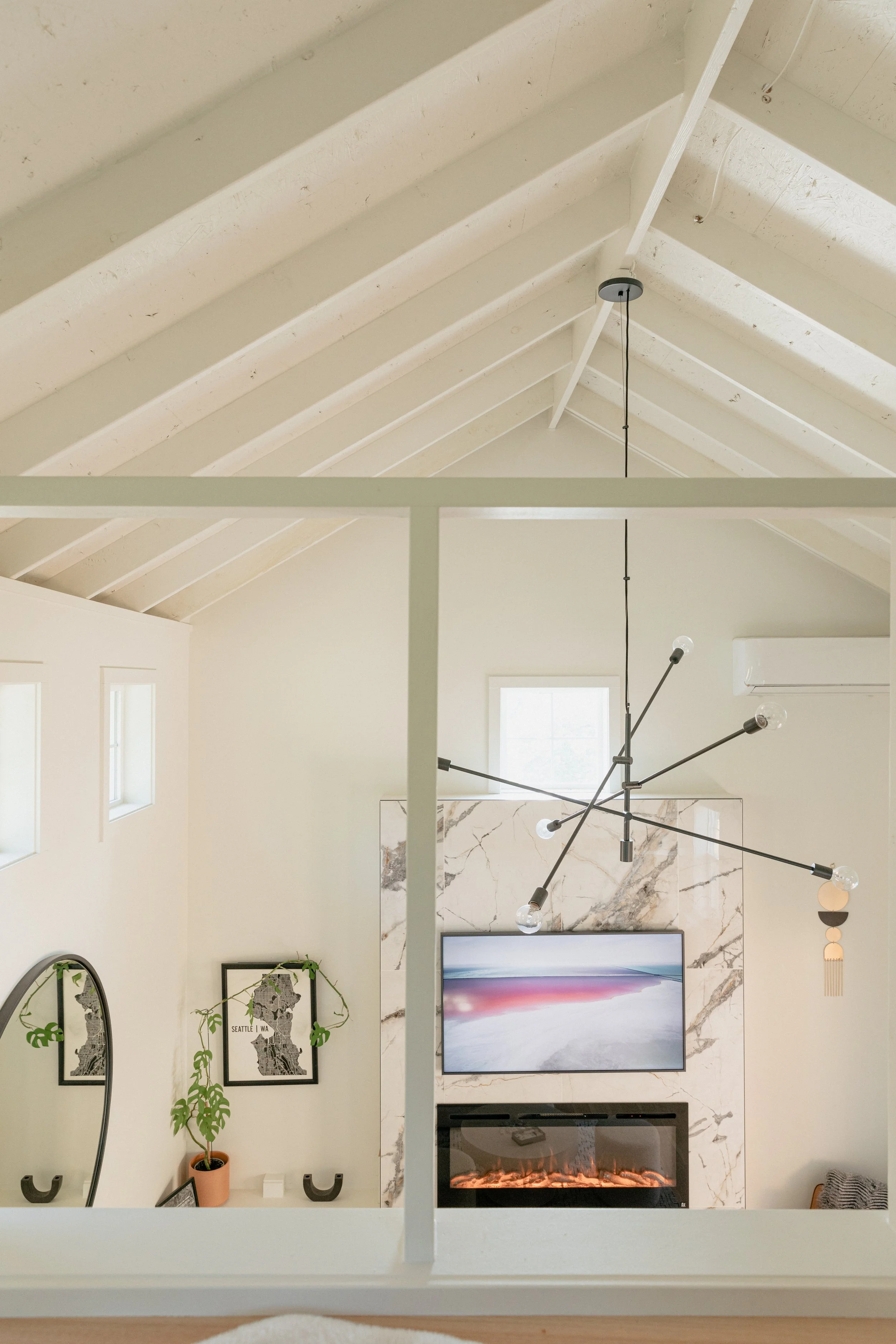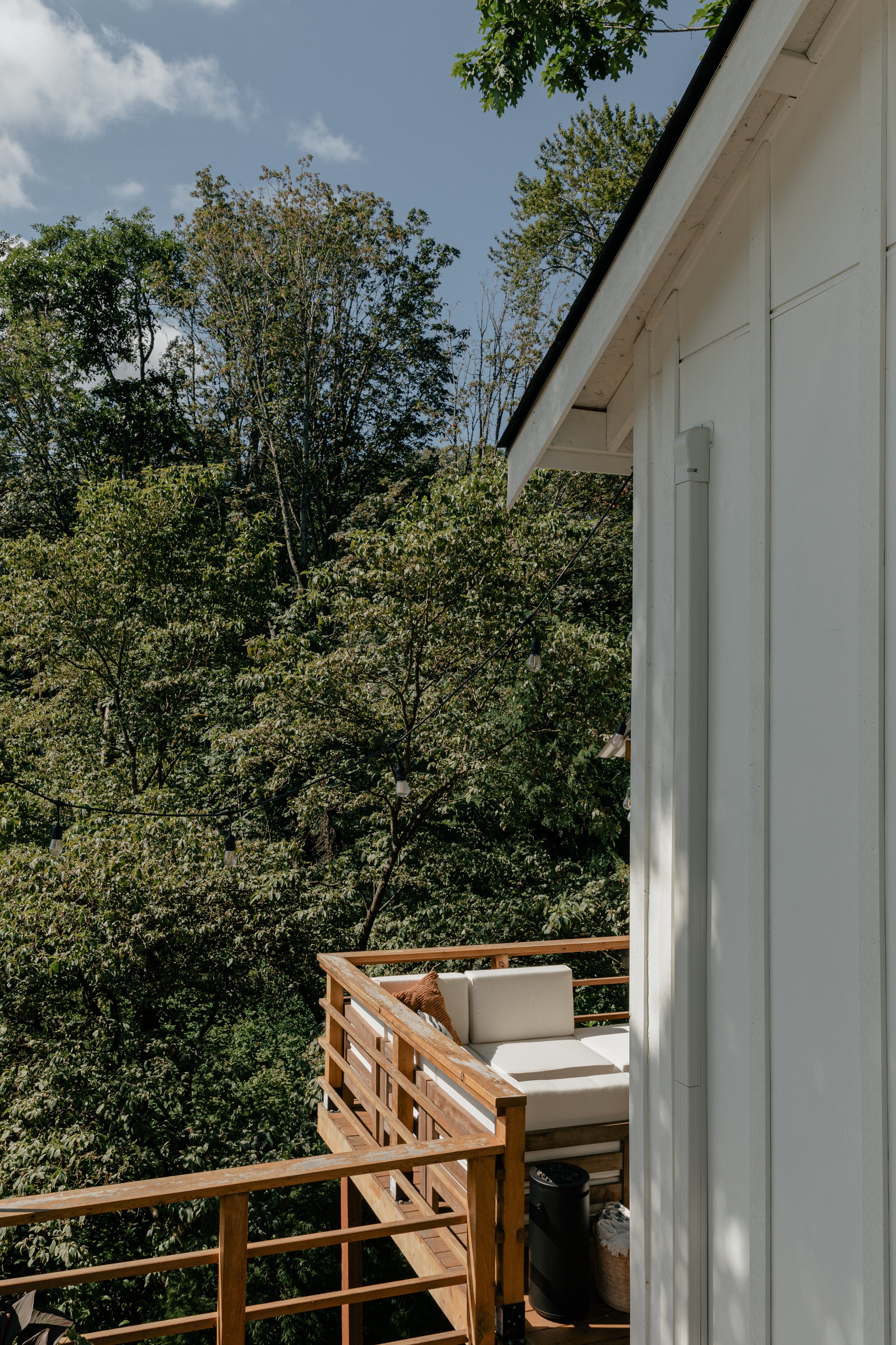 Designed to feel remote and hidden, the original owners of the property had a greenhouse on property. In honoring the shape and space, we designed a thoughtful guest apartment — perfect to read a book, nap, or play games nestled by the fire. A balcony extends from the front doors, with expansive 360 degree views of a variety of native trees, shrubs, a vegetable garden and trails to other parts of this forested escape.